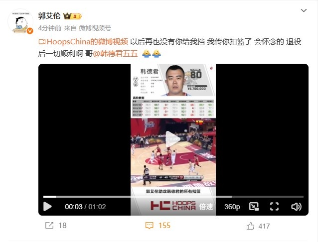 前队友郭艾伦在社交媒体转发了两人配合的扣篮集锦,并配文:“再看不到你为我掩护、我助你暴扣的配合了,会永远怀念这些时刻。祝退役生活一切安好,大哥!”