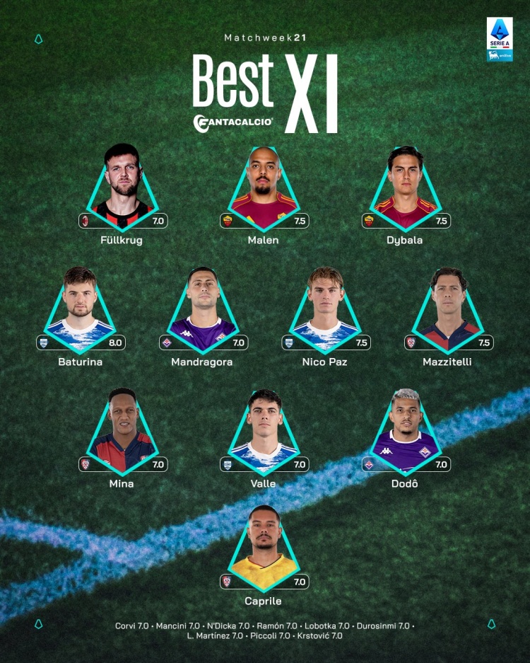 中场:巴图里纳(科莫)、曼德拉戈拉(佛罗伦萨)、尼科·帕斯(科莫)、马齐泰利(卡利亚里)