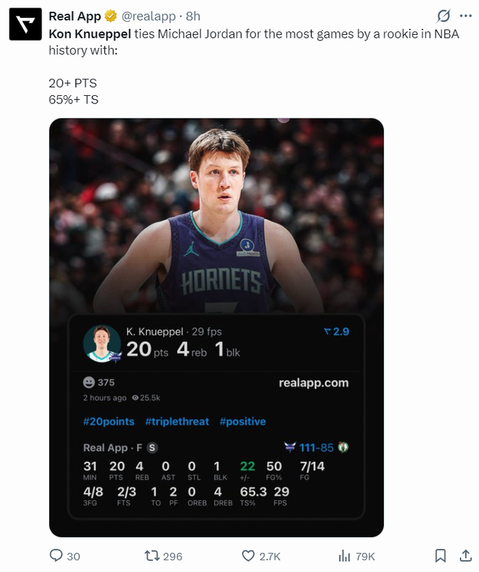 克努佩尔再度创造多项纪录:1.他比肩新秀赛季的迈克尔-乔丹,拿到一样多的20分+真实命中率65%的场次;