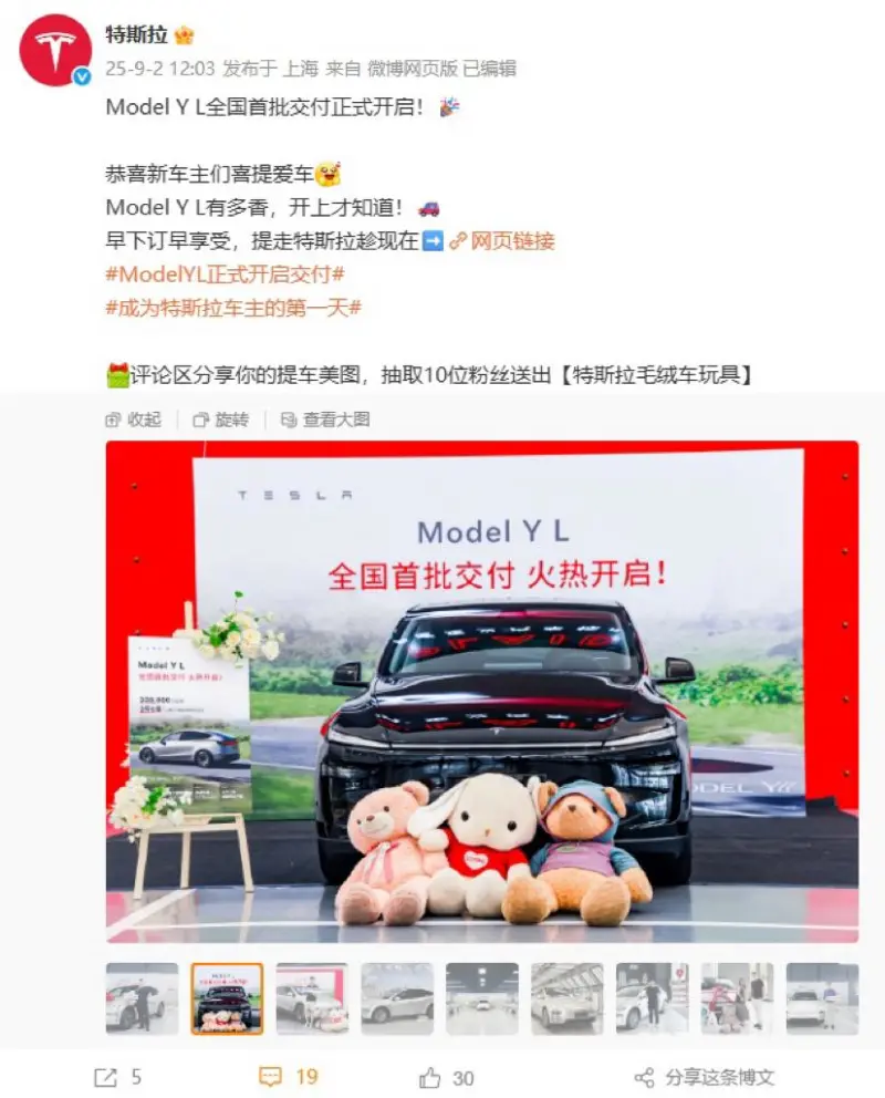 虎扑09月02日讯 特斯拉官方今日宣布,Model Y L 正式开启全国首批交付。新车售价 33.9 万元,定位大六座豪华纯电 SUV,对外观细节、内饰配置、乘坐舒适性及空间方面进行了全面升级。
