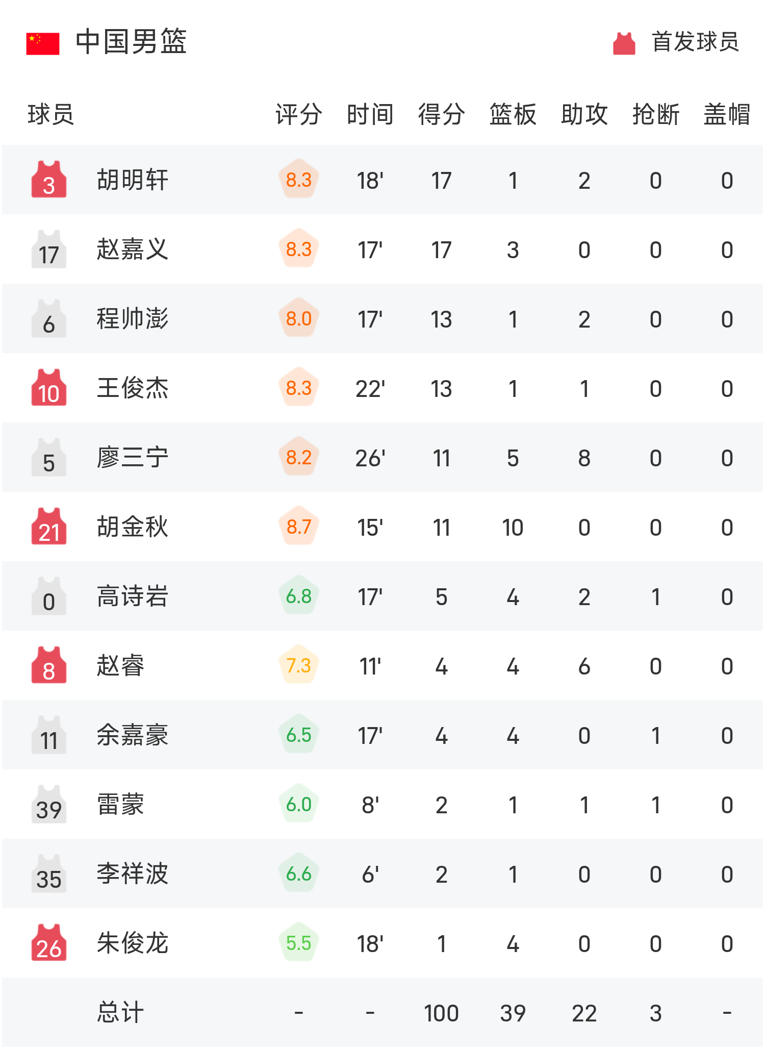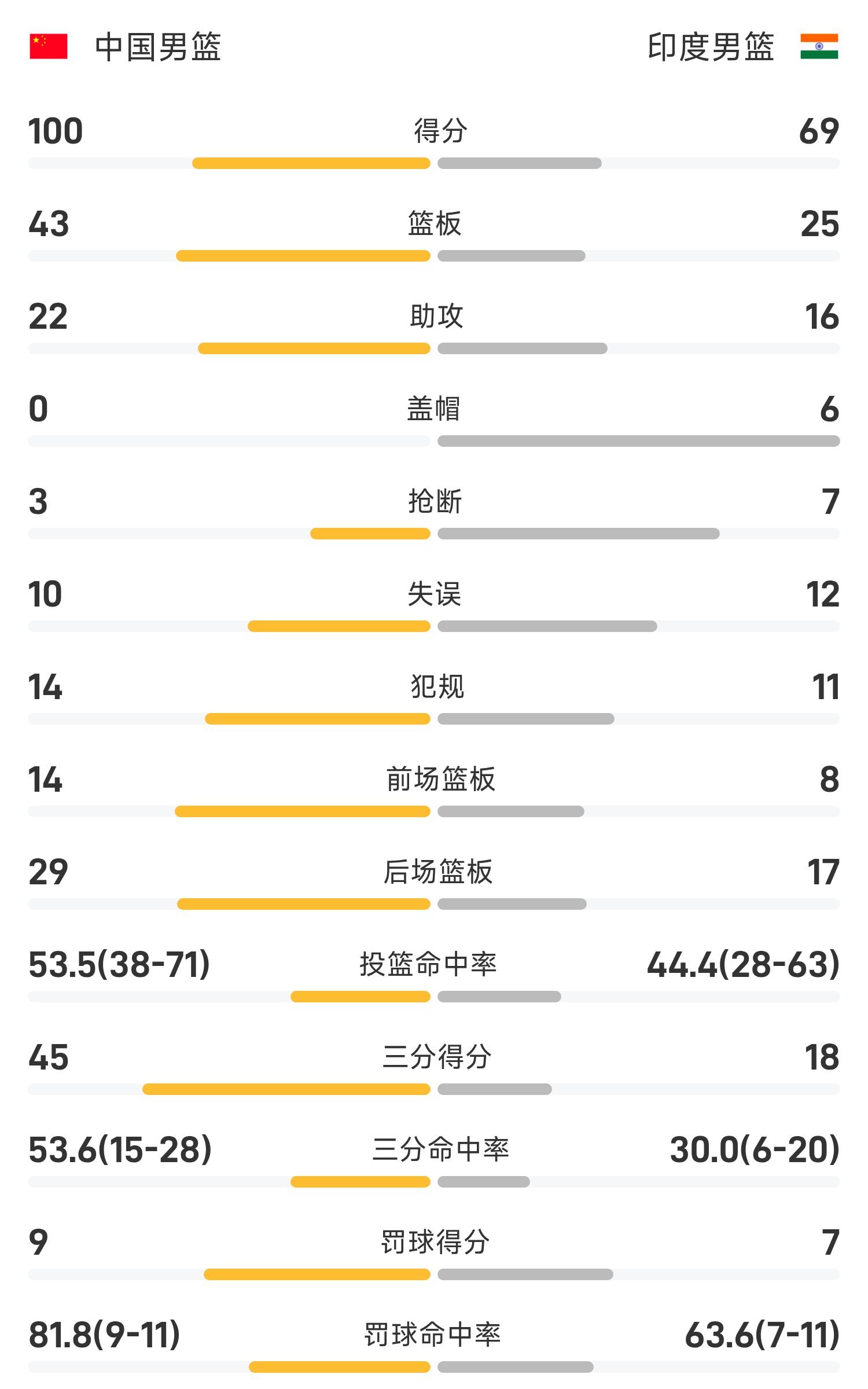 08月07日讯 25赛季男篮亚洲杯 小组赛,印度男篮对阵中国男篮。双方全场战罢,印度男篮69-100不敌中国男篮。胡明轩砍下全场最高的17分1板2助,率领中国男篮成功取胜。